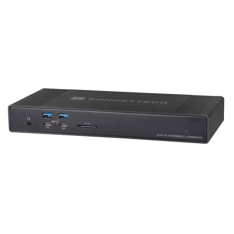 Mit dem Echo 20 Thunderbolt 4 SuperDock können Anwender leistungsstarke Peripheriegeräte per Kabel an ihren portablen Computer anschließen, diesen zugleich aufladen, schnelle kabelgebundene Netzwerkverbindungen unterstützen und SD-Speicherkarten einlesen.